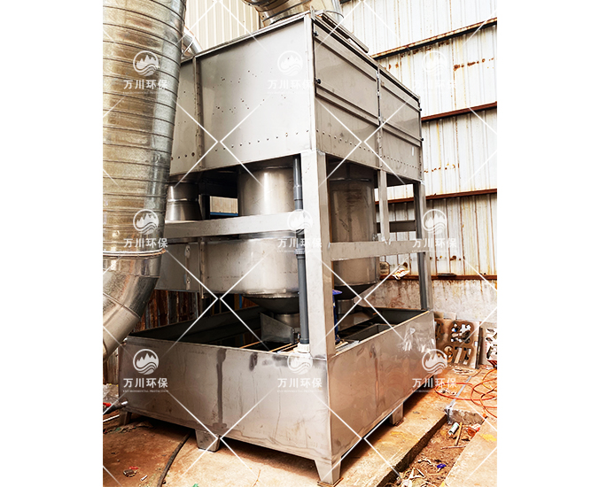 噴淋塔是一種效率高、壓力損失較低的除塵設(shè)備。廢氣正面切向進入至內(nèi)部的噴淋層,通過水洗、噴淋、過濾后漆霧(在循環(huán)水中加入漆霧絮凝劑,使得油性漆霧在水中的溶解性更大)。
